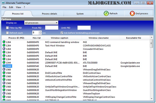Alternate Task Manager can be used to produce expeditiously the details of each process as well as the ability to end any process with a simple click. It also provides you with real-time system information such as physical/available memory, pagefile size, virtual memory, virtual memory available, memory load.