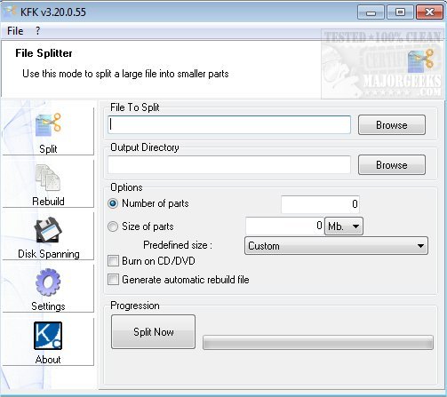 It can help you transfer a large file on floppy disks or a larger file on CD or DVD, and it can also burn the files to CD/DVD and generate an automatic rebuild file - this process allows regeneration of the original file without needing to use KFK.