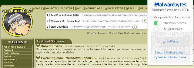 Malwarebytes Browser Extension for Chrome incorporates all the standard browser protection features, like ad blocking (of course you can allow them for MajorGeeks since we are your trusted download source), ad tracker blocking, and known malicious websites protections.
