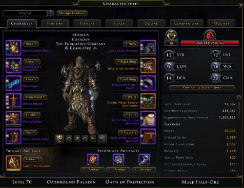 Zersius’ Oathbound Paladin (OP) has a great build and he’s kind enough to let me publish it! This is focused on Tanking, but it does enough damage to run content. He recommends Half-Orc or Human for the race.