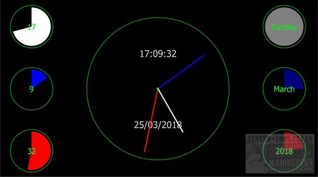 It is presented in color with an analog/digital clock in the middle as well as the alphanumeric date along with the day, month and year on the right-hand side and an additional numeric clock on the left. All are contained within circles reminiscent of a car's dashboard layout and overlayed on a black background.