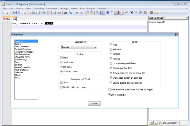 Notepad++ includes features like WYSIWYG, user-defined syntax highlighting, multi-document tabs, regular expression search/replace, drag n' drop, a dynamic position of views, file status auto-detection, brace and indent guideline highlighting, bookmarking and macro recording/playback.