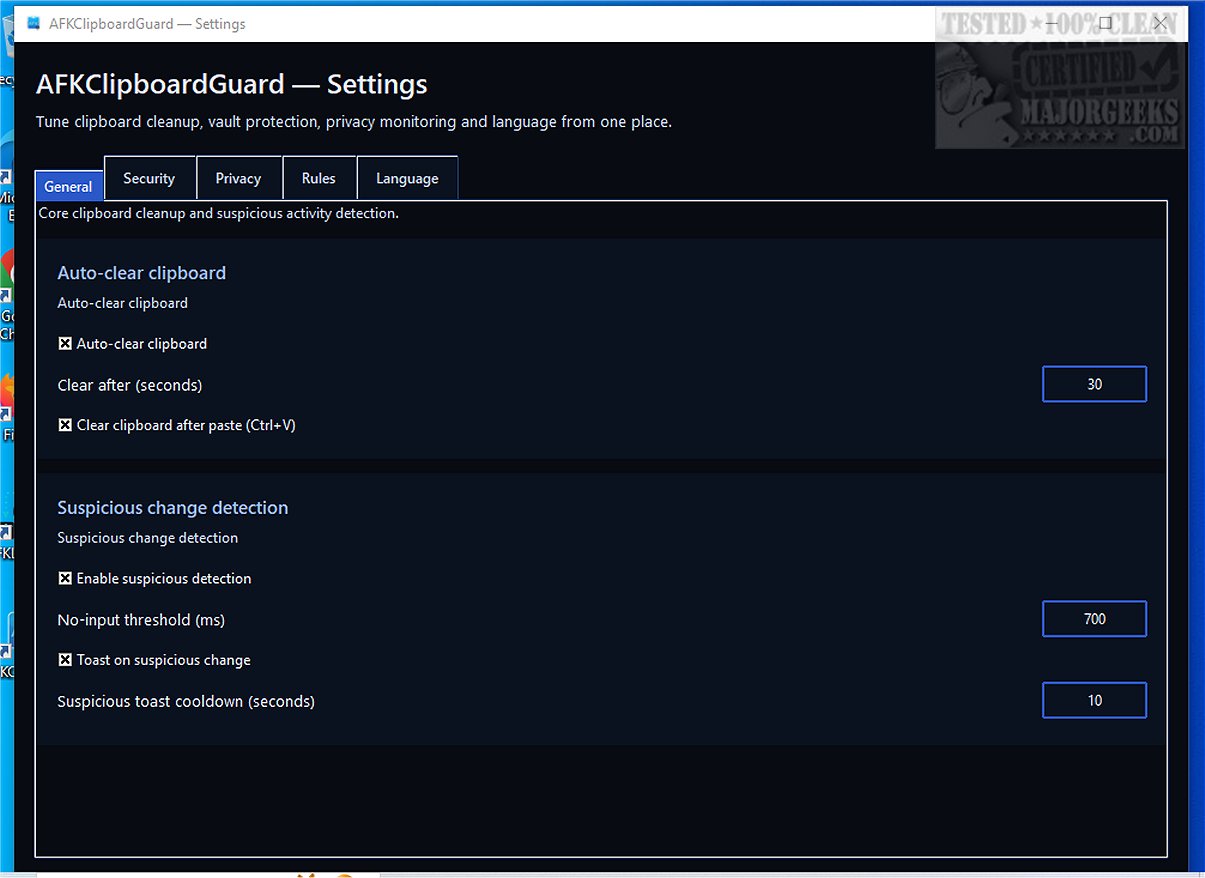 1. Real-Time Monitoring: It analyzes clipboard changes in real-time to determine if the copied content is sensitive, allowing users to configure specific rules for responding to clipboard activities. Depending on these settings, AFKClipboardGuard can issue alerts, clear clipboard contents, or save sensitive data in a secure local vault.