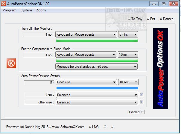 AutoPowerOptionsOK is a free power management app that enables you to increase energy efficiency by providing quick access to customize monitor shutdown, the sleep timer, as well as toggling between energy plans at pre-determined times.