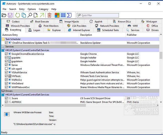 Autoruns Portable provides help with the Hide Signed Microsoft Entries option enabling you to focus on third-party auto-starting images that have been added to your system. Part of this useful download package is a command-line equivalent that can also output in CSV format, Autorunsc.