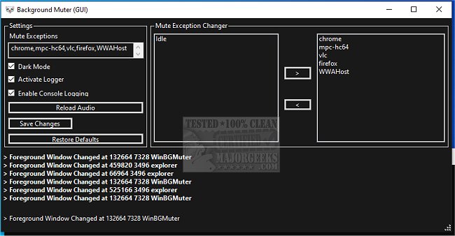 The application is user-friendly and requires no installation; it is ready to use immediately after unpacking, complete with default settings. For users who want more control, Background Muter provides options for customization. It includes a built-in logger and a console logger for monitoring app activity, ensuring users can track audio management effectively. The interface is designed to be simple and intuitive, displaying only necessary features.