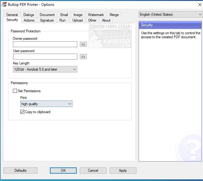 In addition to PDFs, Bullzip PDF Printer supports various output formats including BMP, JPEG, PCX, PNG, and TIFF. Users have extensive control over the printing process, including unattended setup options, a user-friendly graphical interface, and the ability to apply password protection with up to 128-bit encryption for added security.