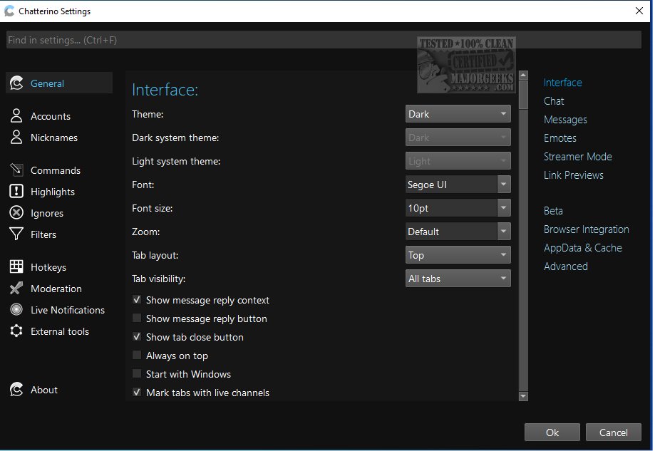 Chatterino offers a wide range of customization options, despite its minimalist design. Users can add multiple accounts, although caution is advised as using several accounts from the same IP may lead to suspension on Twitch. The application features a variety of GUI themes and allows users to modify colors and fonts to suit their preferences.Advanced Options
