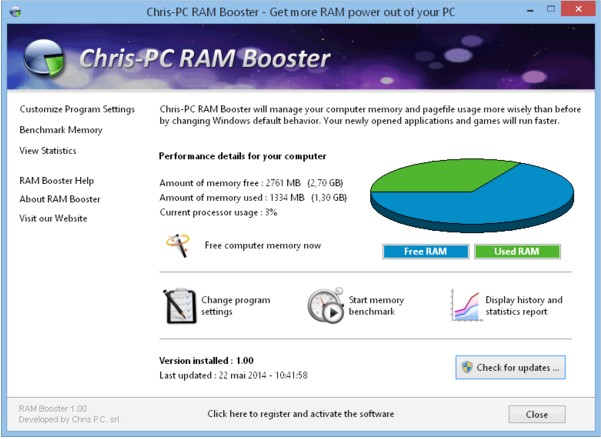 Chris-PC RAM Booster effectively changes Windows default behavior enabling you to productively manage your computer memory and pagefile usage.