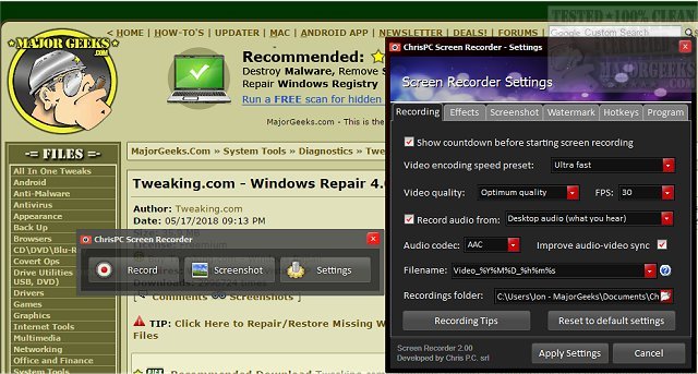 ChrisPC Screen Recorder puts all the screen recording options you need in one toolbox allowing you to record audio to MP4 video files or snap high-quality screenshots in PNG/JPG/BMP formats and more.