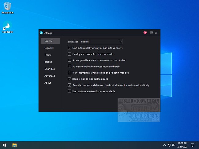 Once items are sorted into boxes, users have the flexibility to choose between large or small display options, assign names to each box, or disband them to return items to a free-range mode. Coodesker provides a user-friendly settings interface where various options can be customized, including the ability to start with Windows, operate in service mode, and utilize hardware acceleration for enhanced performance.