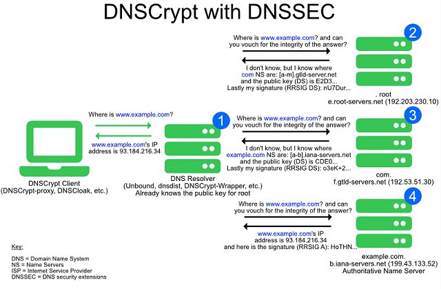- Encryption and authentication of DNS traffic using DNS-over-HTTPS and DNSCrypt protocols.