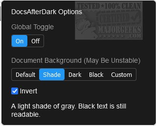 The latest release of DocsAfterDark, version 2.0.3, introduces an open-source extension/add-on that enables users to easily switch dark mode on and off for Google Docs. This tool enhances user experience by changing the document's background to darker shades through a simple selection process from various preset options. Users also have the flexibility to choose custom colors via a menu. Accessing the DocsAfterDark options is straightforward; just click on the icon located in the browser toolbar.