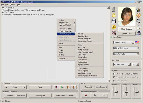 DSpeech will also permit you to change the features of the voices dynamically during the playback (speed, volume, and frequency), to insert pauses, emphasize particular words, or even to spell them out. You can additionally set up the sound quality and specific hardware for recording and will allow you to capture and reproduce the content from the ClipBoard.