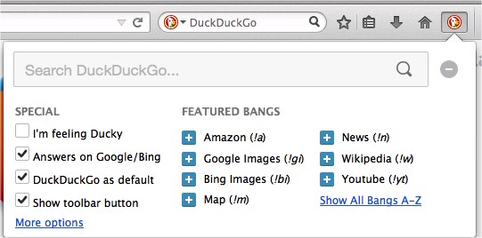 Add a handy DuckDuckGo toolbar button to your browser for easy access to !bang tags (removable).