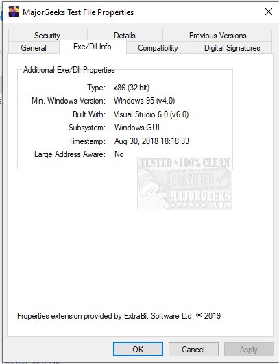 By integrating an additional tab in the context menu properties, ExeProperties streamlines the verification process, enabling users to confirm file compatibility at a glance. In addition to indicating the file's architecture, the tool also provides information on the minimum Windows version required for the file to run, as well as details about the version of Microsoft Visual Studio that was used to build the EXE or DLL.