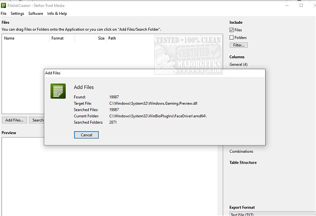 Files or folders can be dragged n' dropped into Fileslist Creator, or you can add them via the add files or search folders buttons. You have the option to determine which files/folders should be included and export format selection.