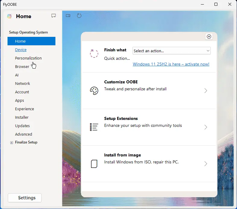 The FlyOOBE update also includes various enhancements such as a new App Settings view, a simplified menu, and a selection of customizable background images. The page previously known as Reinstall OOBE has been renamed to Advanced to provide clearer navigation. Additionally, extensive code refactoring has been performed to prepare for future expansions of the OOBE interface.