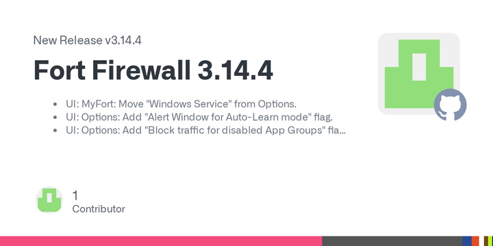 Fort Firewall 3.14.4 comes with various changes, including moving "Windows Service" from Options, adding "Alert Window for Auto-Learn mode," restricting traffic for disabled App Groups, and improving the Administrator check.