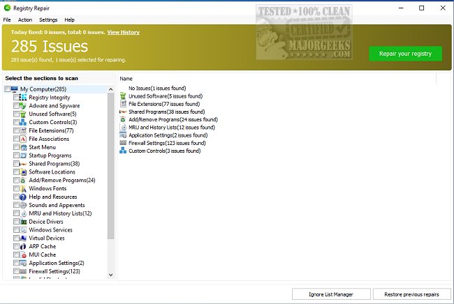 The tool also features an 'ignore list' to enhance security by excluding certain entries from scans. It identifies various registry issues, including invalid paths, file associations, obsolete software entries, and more, ensuring a comprehensive cleaning process.