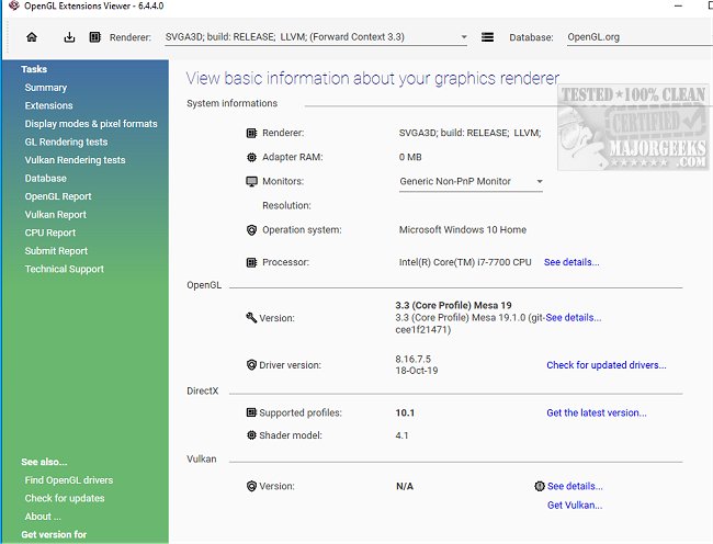 GLview, previously known as OpenGL Extensions Viewer, has released version 7.4.1, which offers an extensive array of details about your current OpenGL 3D accelerator and other relevant system information. The application scans your system to present essential details such as the vendor name, version implemented, and renderer name through a user-friendly interface. The left menu of GLview is neatly organized into categories, including summary, extensions, display modes/pixel formats, and rendering tests. Users can generate reports on OpenGL, Vulkan, and CPU, among others.