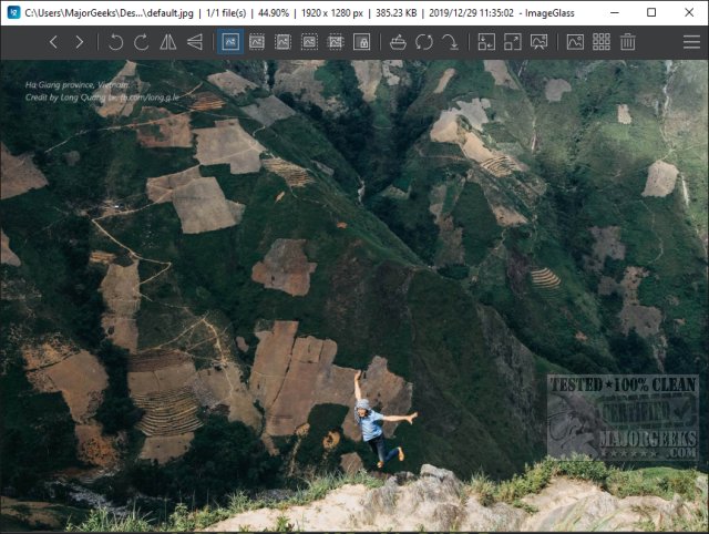 ImageGlass is capable of handling over 70 image formats, such as GIF, JPG, PNG, BMP, and ICO. The interface includes a toolbar with icons and a menu located at the top-right corner. Key features of ImageGlass include clipboard functionality, the ability to set images as desktop backgrounds, and a slideshow mode. Users can stretch, flip, and navigate through images seamlessly.
