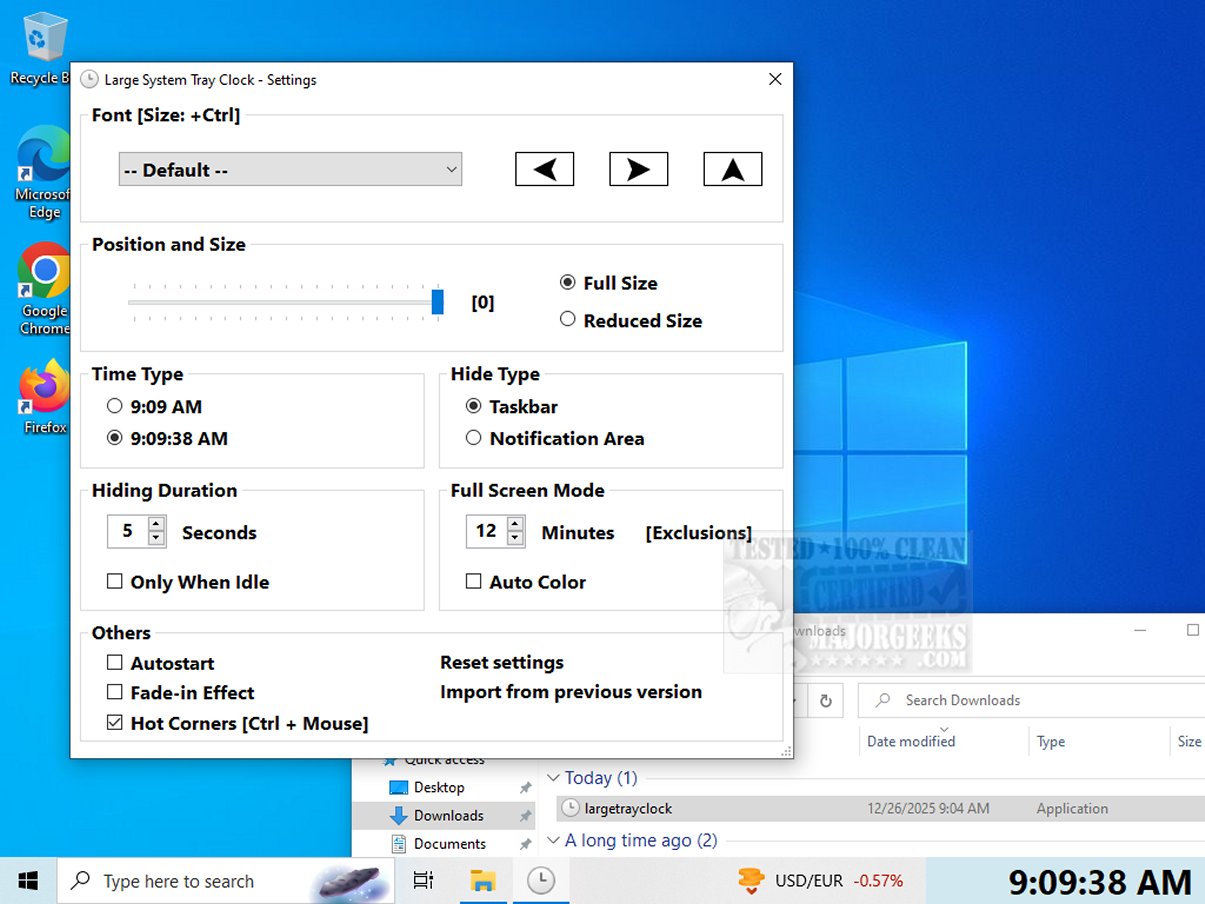 - User-Friendly Design: The interface is designed to be straightforward, with options to display the clock in the screen corners or in full-screen mode. It maintains accessibility to taskbar functions, which are hidden during full-screen use but reappear after a defined delay.
