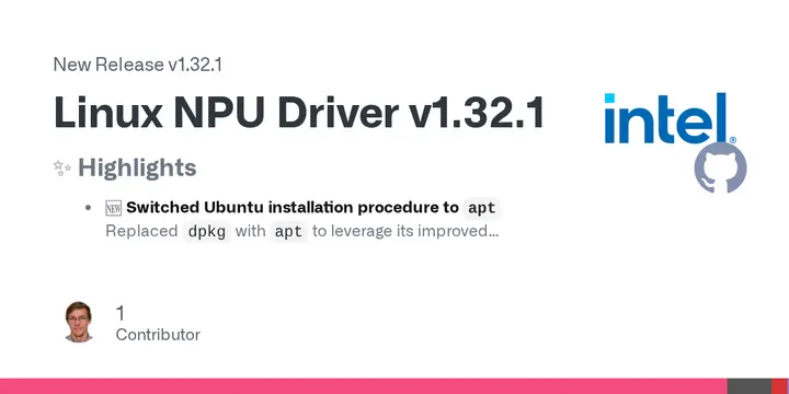 Intel has released Linux NPU Driver v1.32.1, which transitions from using dpkg to apt for installations on Ubuntu 24.04, resolving dependency conflicts. The updated driver now supports newer Intel chips, including Meteor Lake, Arrow Lake, and the upcoming Lunar and Panther Lake families, and includes OpenVINO 2026.1 along with a new GPU driver stack. Installation requires some additional steps, such as obtaining a Level Zero loader from the kobuk-team PPA and ensuring the user is part of the render group for hardware access. The release notes emphasize the importance of verifying GPG signatures to prevent potential tampering and ensure the integrity of the installation package