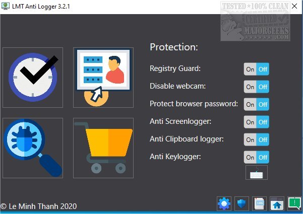 LMT Anti Logger uses real-time protection to help prevent viruses, trojans, and keyloggers as well as blocking keyloggers, screen loggers, clipboard loggers, and webcam loggers. It also includes a password manager and a registry guard. LMT Anti Logger will also permit you to config Windows Security and provides you with a secure avenue for online shopping and payments.