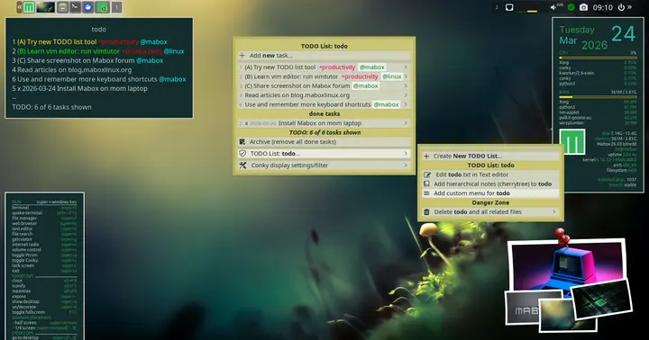Mabox 26.03 arrives with specific improvements to Conky handling that allow users to disable accidental clicks and view battery status in the default widget. A new TODOlist tool integrates a dynamic menu with CLI access for managing tasks without leaving the desktop environment. An improved shortcut editor accessible through a Conky widget makes Openbox configuration less painful by allowing instant reloading of settings.