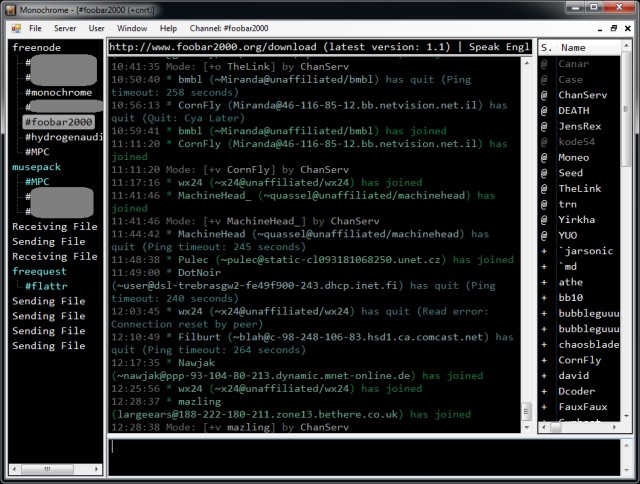 Monochrome is an IRC client intended for long-time IRC users with the goal of security, reliability, and stability despite IRC network failures or connectivity problems.