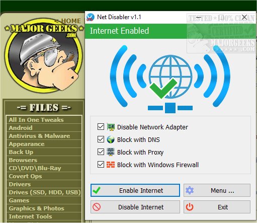 Net Disabler 1.2 has been released as a user-friendly, portable tool designed to quickly block internet access for various reasons. This versatile application allows users to disable internet connectivity on devices, block access using DNS settings, or utilize the Windows Firewall for effective control. It provides a straightforward solution for those looking to disconnect from the internet temporarily, making it particularly useful for parents who want to manage their children's online activities and ensure they remain focused on tasks.