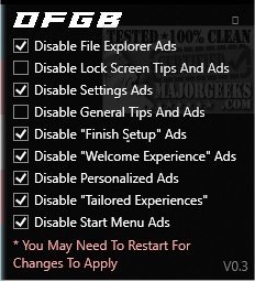 OFGB operates by modifying your system's Windows Registry and can disable all kinds of ads, including Lock Screen tips and tricks, File Explorer ads, Settings ads, Finish Setup ads, Welcome Experience ads, personalized ads, Tailored Experiences ads, and Start Menu ads. It is always recommended to have a restore point in case you run into issues.