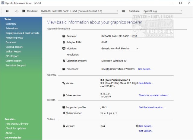 OpenGL Extension Viewer runs a search of your system and then displays the vendor name, the version implemented, the renderer name through a well-organized interface. It provides an at-a-glance left menu consisting of summary, extensions, display modes/pixel formats, and rendering test categories. Some reports can be pulled like OpenGL, Vulkan, and CPU.