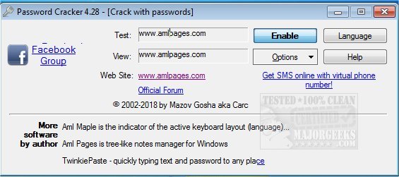 Password Cracker isn't without a few bugs. Although we did have the latest version, it kept prompting us to go to their homepage for the "latest version." They also provide links to download their other programs. There's an annoying "Here could be your advertising" flashing on the screen. By default, the program has no sounds but uses the computer beep, which can be annoying if you start moving your mouse around while the program is open and looking to recover a password. You can disable this in options.