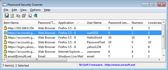 Password Security Scanner is a freeware app that can scan the passwords stored by popular Windows applications Microsoft Outlook, Internet Explorer, Mozilla Firefox, and displays security information about all these passwords.