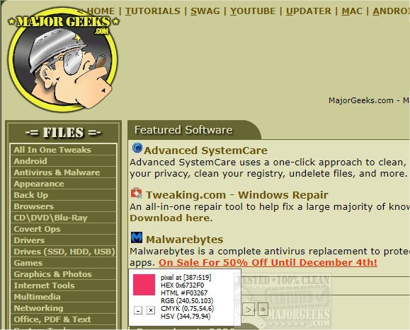 Pixie will be perfect for web designers, graphic artists, or anyone hunting for cool colors for your own use. Just run Pixie, point to the color, and it will tell you the HTML, HEX, RGB, CMYK, and HSV values of color. Then you are free to use these values to reproduce the color. Pixie also shows the current X/Y position of your mouse.