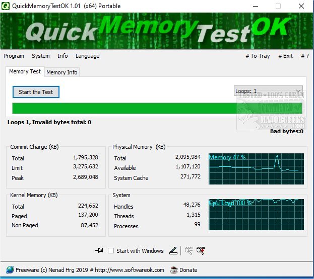 QuickMemoryTestOK is a free utility for quickly testing your PC's RAM.