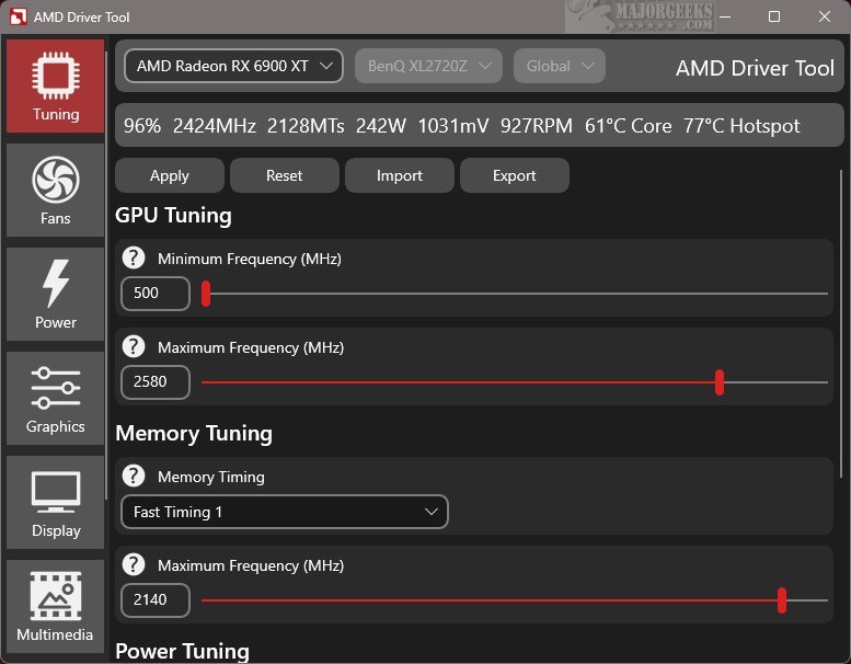 RadeonTuner allows users to make fundamental adjustments such as modifying clock speeds, fan curves, and power limits, in addition to tweaking graphics settings for individual games and display preferences. A standout feature is its support for importing and exporting settings, making it easy to restore custom configurations after updates or driver installations, thus avoiding a return to default settings.