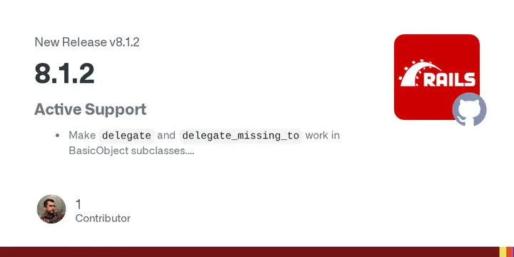 Rails 8.1.2 has been officially released, featuring upgrades and bug fixes for various parts of the framework. Active Support received significant updates, including improved handling of delegate methods with BasicObject subclasses, locale inflector work, and enhanced UTF-8 string returns from as_json. Active Record also saw important fixes, such as updated query count management in the RuntimeRegistry and proper handling of SQLite3 schema dumps. The release also includes enhancements for PostgreSQL users, Action View, Action Pack, Action Cable, Action Text, and Active Storage, among other improvements.