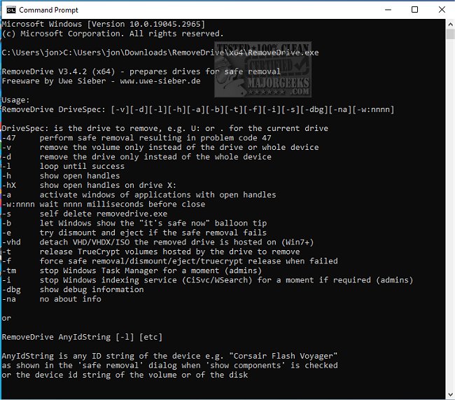 - -f: Forces safe removal if the process fails (requires admin privileges for Vista and later).