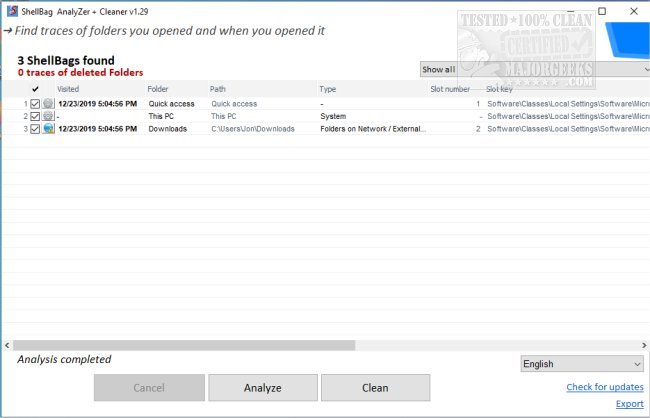 Shellbag Analyzer & Cleaner is a straightforward tool from the makers of PrivaZer that is capable of displaying and removing Shellbag-related information.