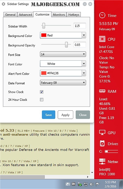 Sidebar Diagnostics allows you to customize what information is displayed as well as what order they appear. In essence, this is nice if you want to pay attention to specific areas while working. You can set up adjustable alerts for temperature for your CPU and GPU or bandwidth if you choose.
