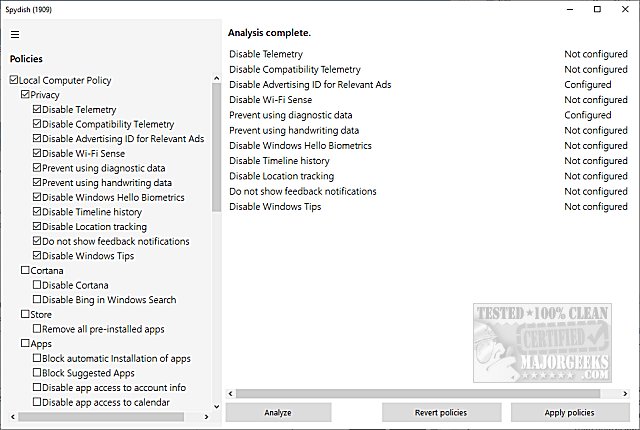 Spydish integrates the most critical Windows 10 privacy policies into a graphical user interface (GUI) and allows you to perform a privacy check against these policies quickly.