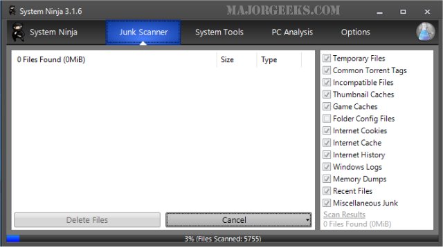 It contains a unique dual cleaning engine. It scans your entire hard drive performing a thorough initial scan, identifying junk based on heuristics. System Ninja then continues to check locations known to contain junk based on several routines.