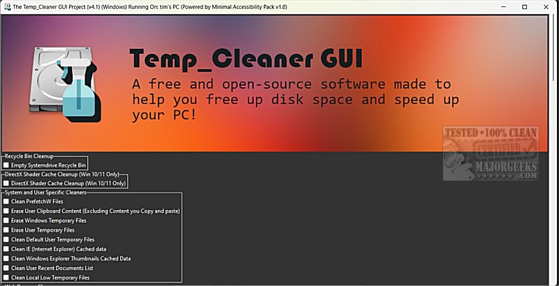 Temp_Cleaner GUI is a free and Open Source app to free up disk space and speed up your computer.