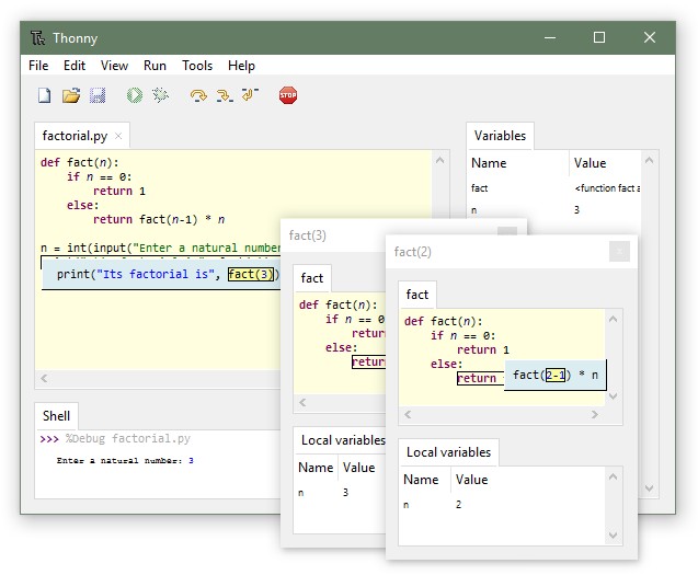 4. Understanding Function Calls: Thonny provides a clear representation of function calls, complete with local variable tables and code pointers, which is essential for comprehending recursion.