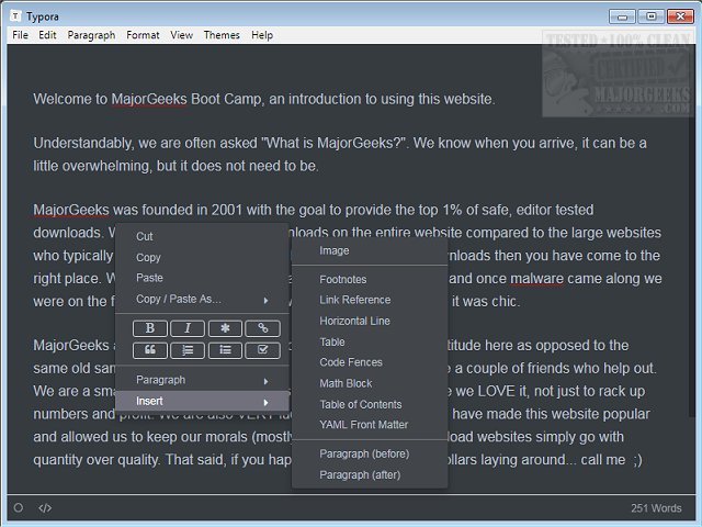 Users can easily insert elements such as images, footnotes, tables, code blocks, math equations, and more through the right-click context menu. Typora also allows for text customization and editing through accessible format and classic paragraph menus. Overall, Typora is a reliable, user-friendly editor that combines functionality with aesthetic appeal, making it an excellent choice for anyone interested in Markdown editing.