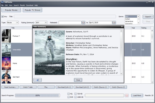 VidMasta enables full control over downloading, searching, reading about, previewing, and watching any movie or television title currently being shared online.