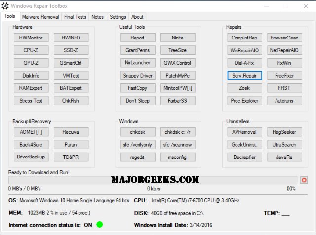 Windows Repair Toolbox includes most third-party applications and Windows utilities you might need to repair any Windows problems in one small application. Video tutorial available.